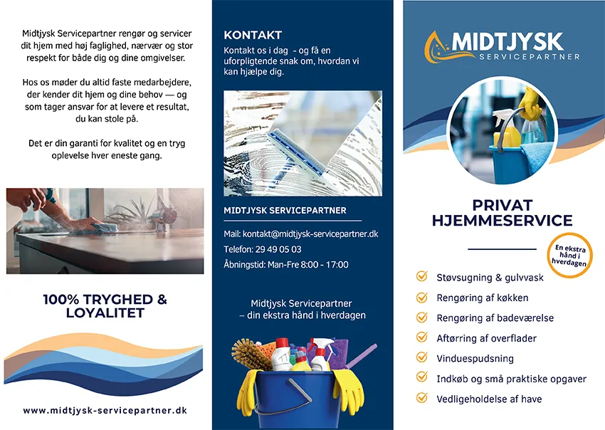Med vores service får du et rent og velduftende hjem. Vi støvsuger og vasker gulv - vi aftørre overflader - pudser vinduer - rengør køkken og badeværelse - og har du opgaver som fx tøjvask, strygning - så klare vi også det.